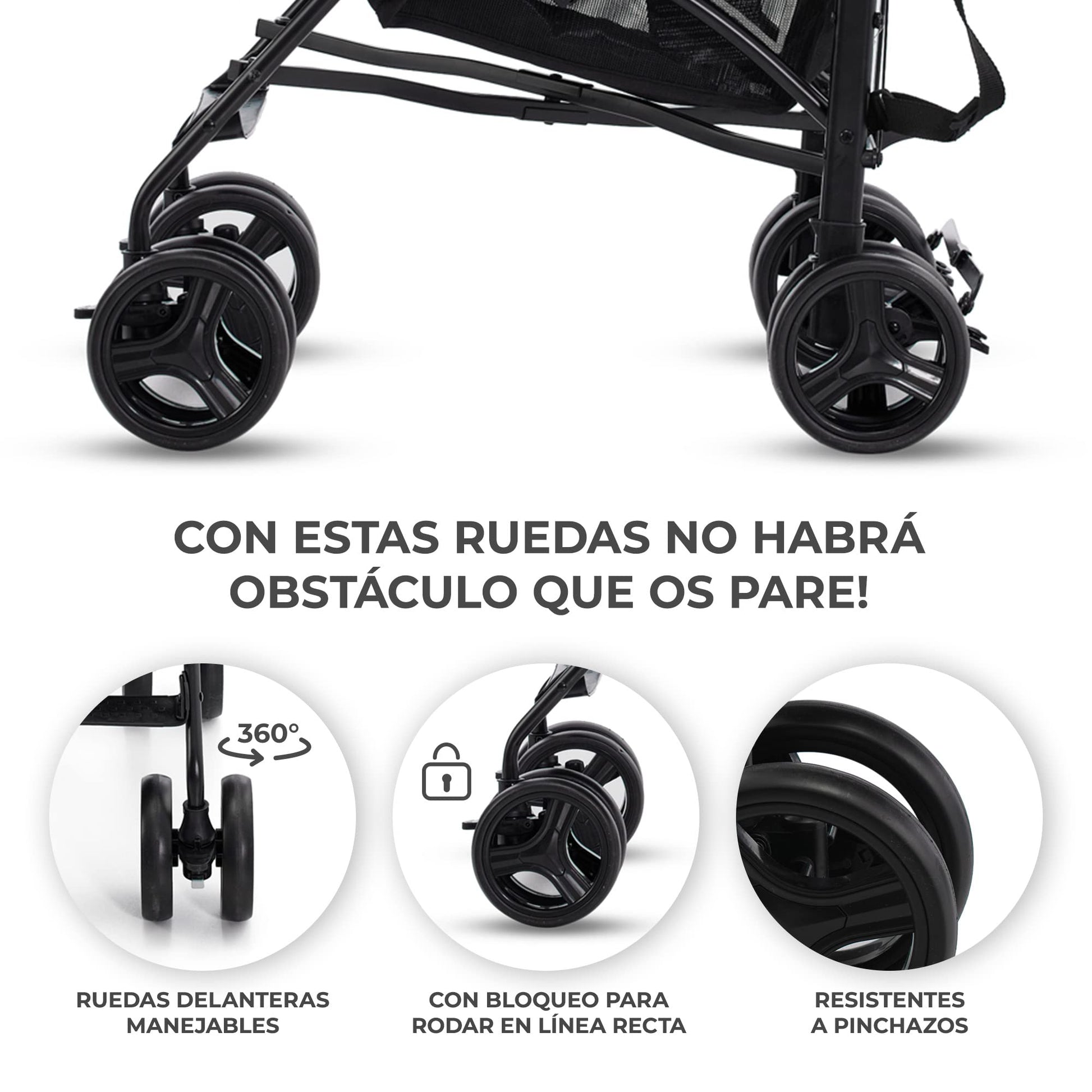 - ✅ PRÁCTICA: las ruedas están hechas de espuma resistente a pinchazos. Las delanteras rotan 360 grados y cuentan con bloqueo de giro. Como están amortiguadas, superan sin problemas aceras irregulares.